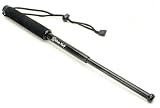 振り回している感じは「特殊警棒」というよりは、40cmの木の棒という軽さです。しかし、当たると木の棒とは比較にならないほど痛いです。目の前で軽く振り回すだけでも「ブン、ブン」と音がするくらいに素早く取り回せます。「シャキ!」と伸ばせばガタもなくガッチリと固定します。当然、振り回してる時にガタが出てきて勝手に縮んだり、変なカチャカチャ音がしてチャチな印象を与える事もありません。